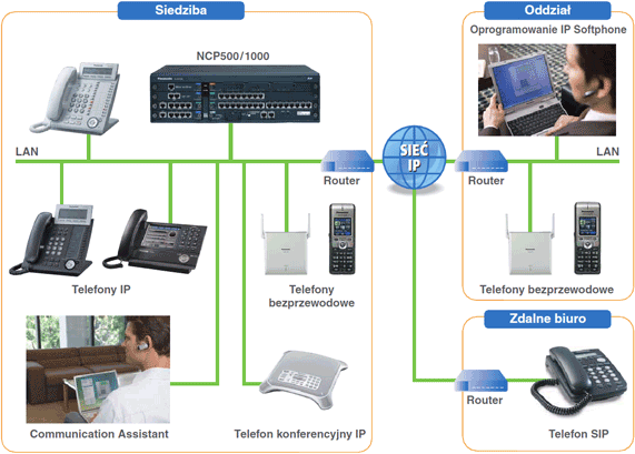 Dzięki dołączeniu sieci IP do istniejącego systemu, istnieje możliwość zarządzania systemem telekomunikacyjnym obejmującym całą firmę, począwszy od biura centrali po najodleglejsze przedstawicielstwa, oddziały i placówki. Technologia IP może znacznie poprawić wydajność zarządzania, jednocześnie tworząc bardziej komfortowe środowisko. Centrale Panasonic mogą być także łatwo rozszerzane dla zaadaptowania do przyjętej infrastruktury oraz zmian zachodzących w środowisku pracy.